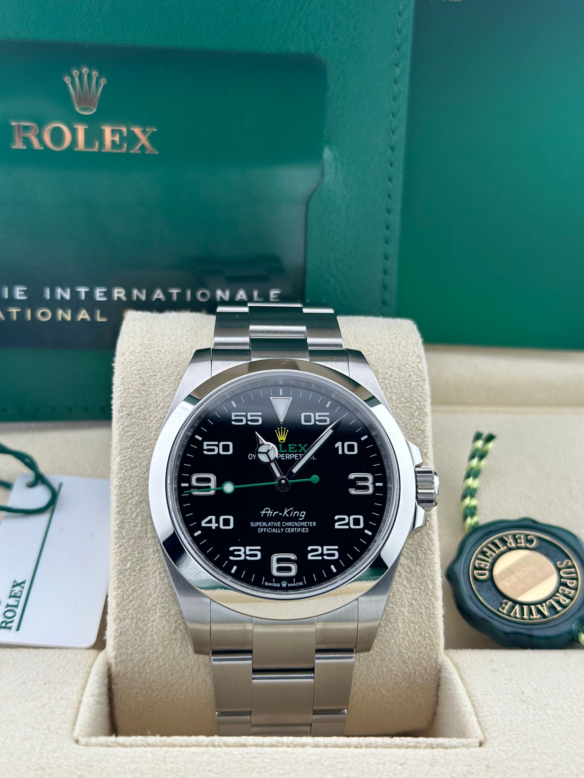 Powered by the Rolex in-house Caliber 3230, the 126900 offers outstanding precision and reliability, boasting a 70-hour power reserve and a Superlative Chronometer certification for accuracy within -2/+2 seconds per day. The Air-King is a testament to Rolex's commitment to craftsmanship, heritage, and innovation.