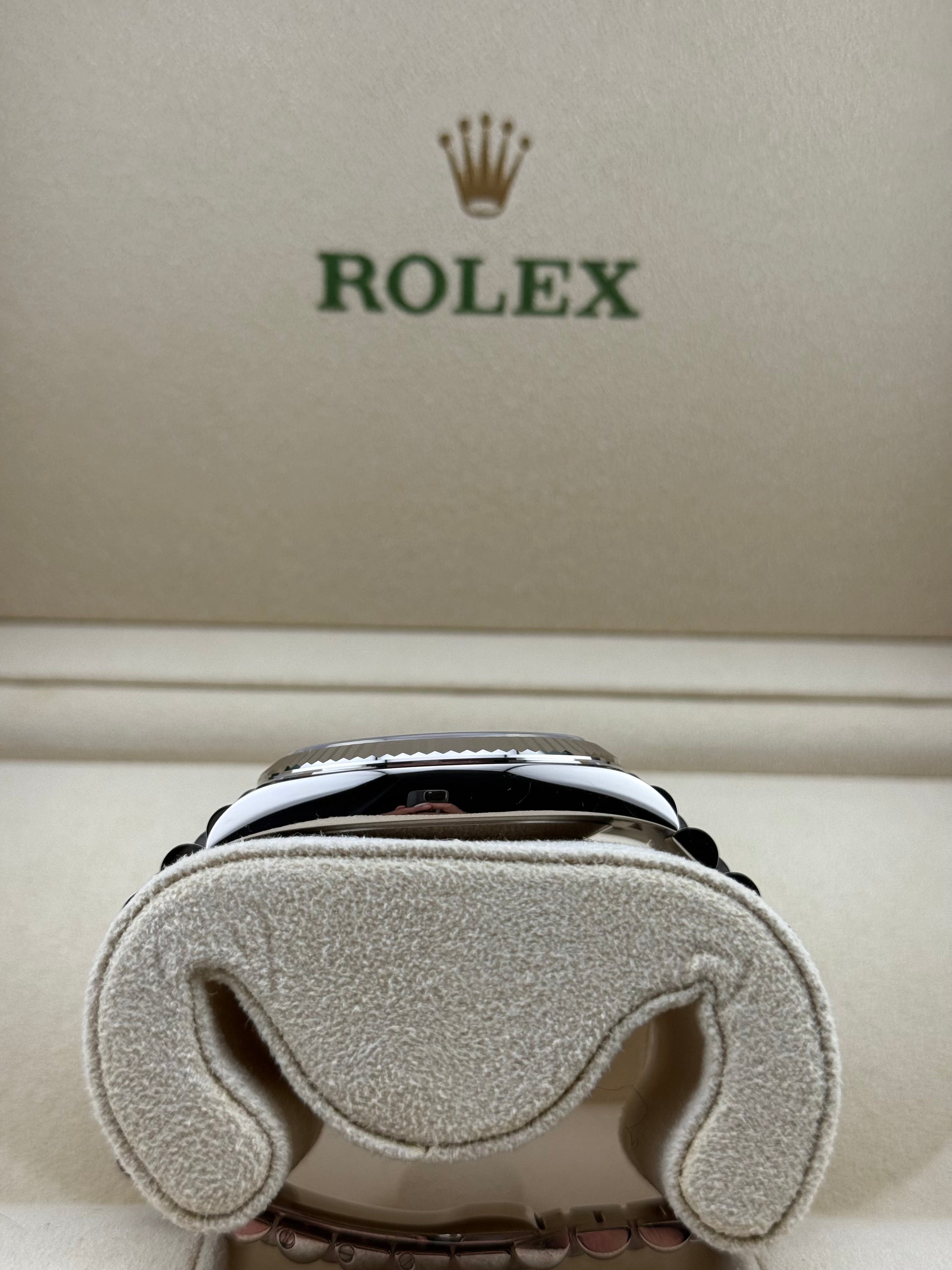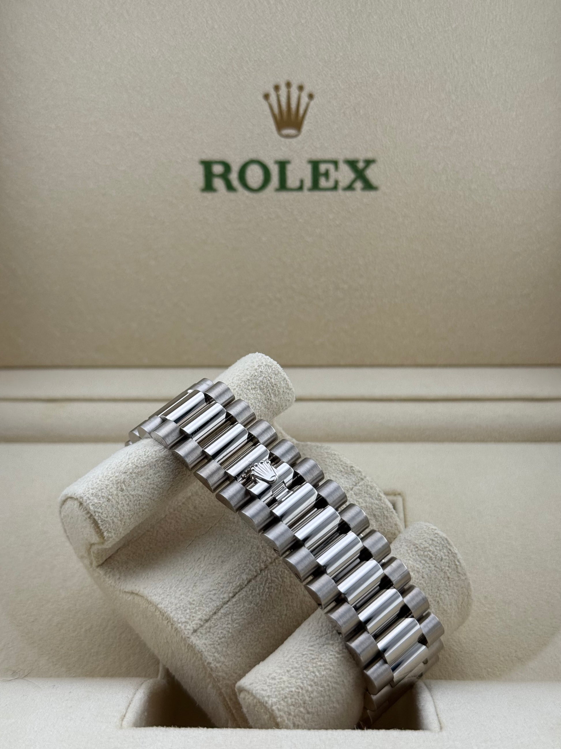 Framed by the signature fluted bezel and housed in a 40mm Oyster case crafted from solid 18k white gold, this Day-Date offers a refined yet commanding wrist presence. The dial is accented with white gold Roman numeral hour markers and Rolex’s hallmark day and date displays symbols of the model’s legacy as the “President’s Watch.”
