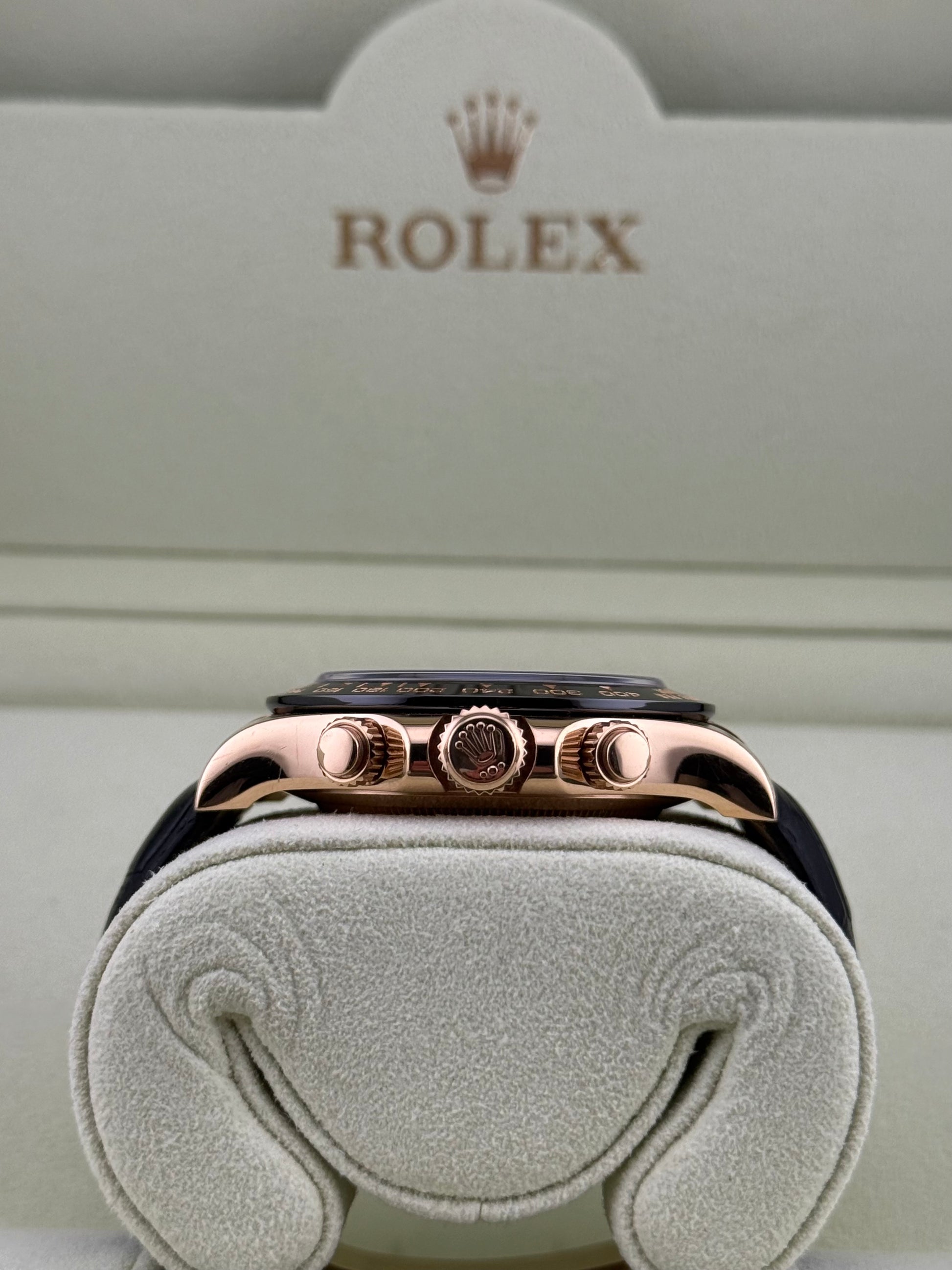 Crafted in Rolex’s proprietary 18k Everose gold, the case is beautifully paired with a rich chocolate dial and contrasted by the black Cerachrom bezel. This earlier reference comes fitted on a black leather strap with an Everose gold clasp, giving it a more classic and refined feel on the wrist compared to newer Oysterflex models.