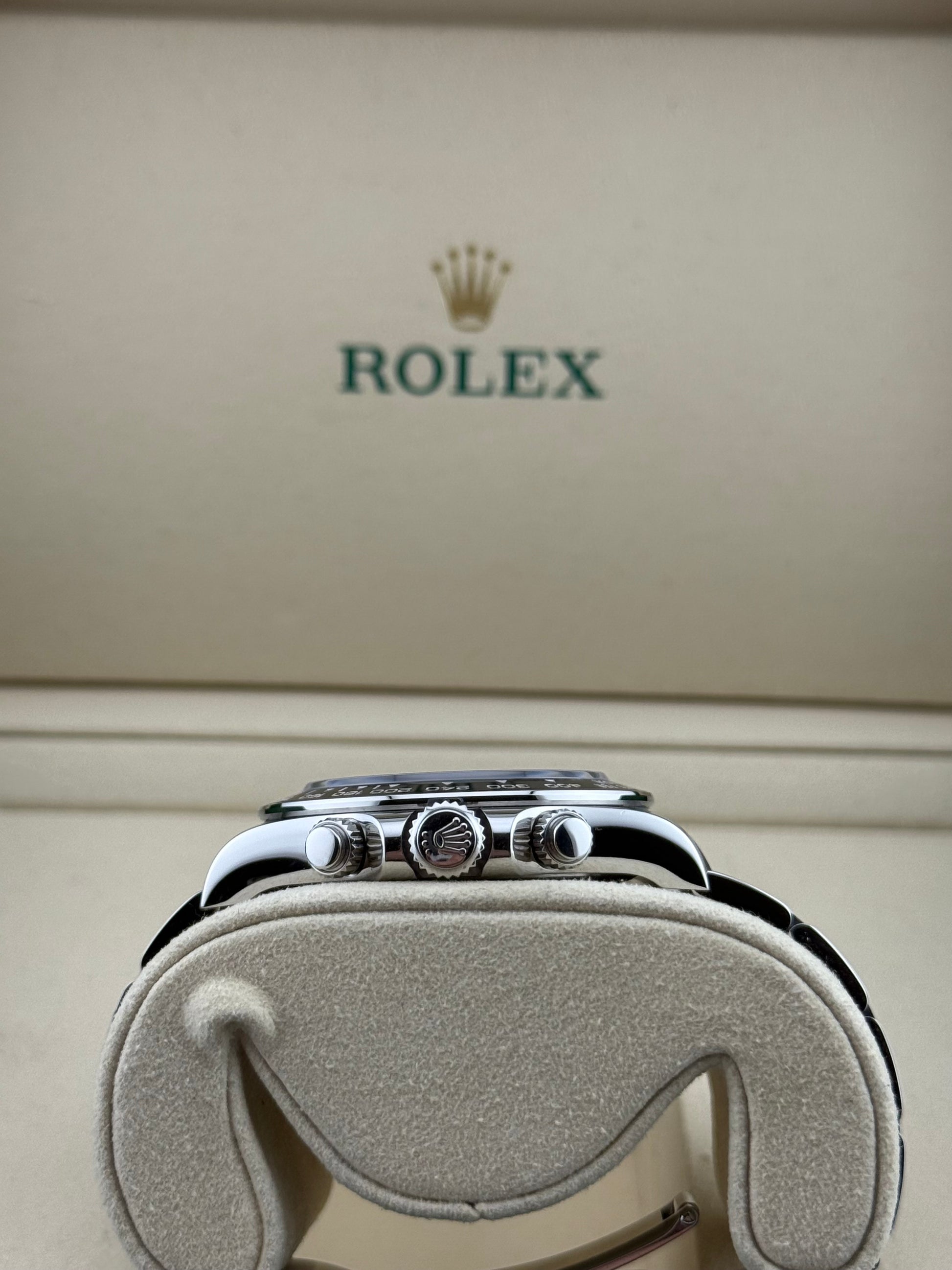 The Rolex Daytona with is a highly sought-after timepiece in the Rolex lineup. This model features a 40mm Oystersteel case, renowned for its durability and resistance to corrosion. The black dial, accented with luminescent hour markers and hands, provides excellent legibility under any lighting conditions.