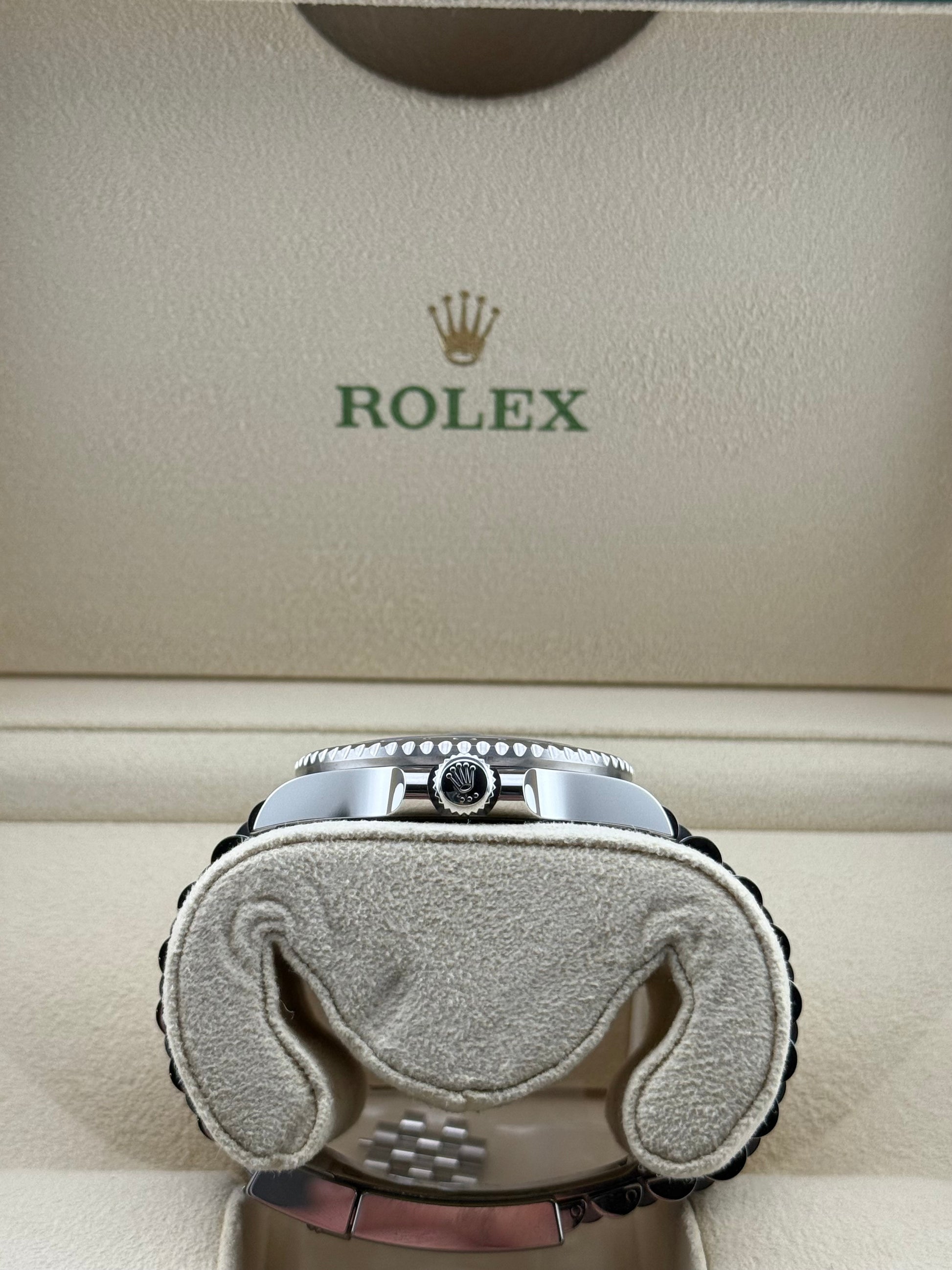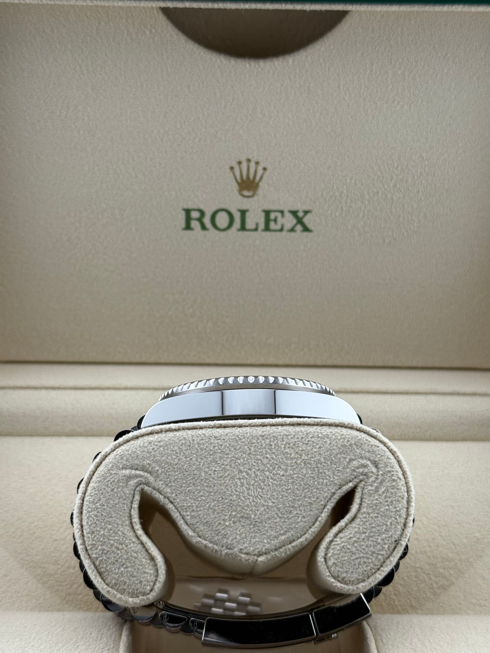 The black dial is clean and legible, enhanced by Chromalight luminous hour markers and the signature green GMT hand, adding a pop of color and function. Housed in a 40mm case, this GMT-Master II runs on the Calibre 3285 movement, offering a 70-hour power reserve and Rolex’s renowned precision and reliability.