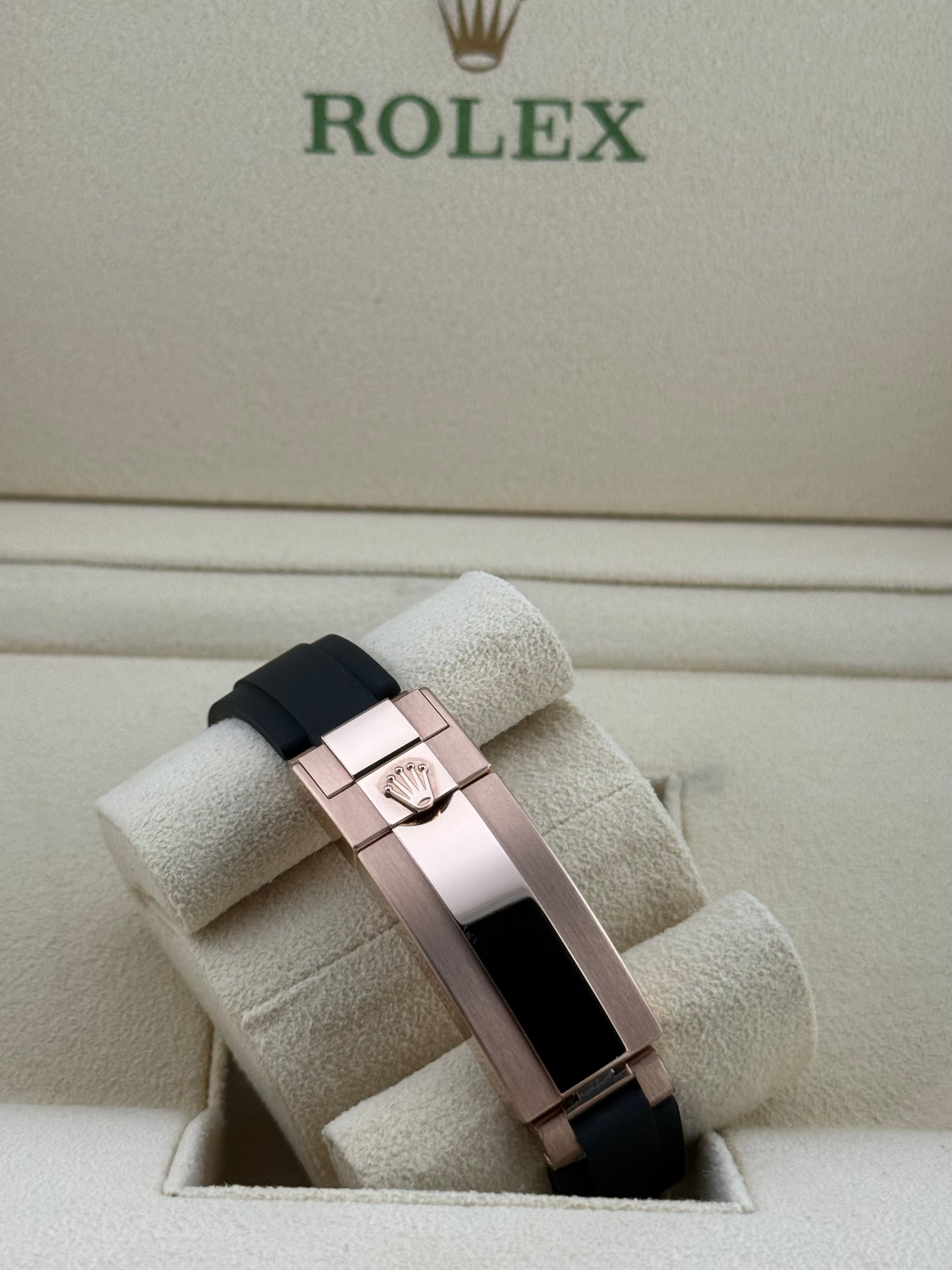 Crafted in 18k Everose gold, the 37mm case is paired with Rolex’s signature black Cerachrom bezel and Oysterflex rubber strap, offering both durability and everyday comfort. What truly sets this watch apart is the factory pavé diamond dial - set with brilliant-cut diamonds that give it a bold, luxurious presence without losing its sporty DNA.